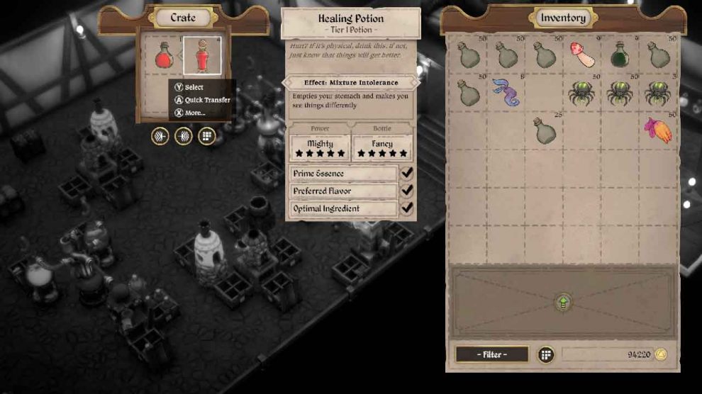 คุณสามารถไปได้เร็วเท่าที่คุณรู้สึกสบายใจ จริงๆ แล้ว ไม่มีอะไรหยุดคุณจากการปรุงยาระดับ 1 ตลอดไป คุณจะไม่ก้าวหน้าภารกิจหรือทำเงินได้มากนัก การใช้วัสดุและอุปกรณ์ที่แตกต่างกัน สามารถปรุงยาได้ในระดับความแรงที่แตกต่างกัน โดยมีโปรไฟล์รสชาติที่แตกต่างกัน ยาทุกตัวมีเวอร์ชัน “เต็ม” ซึ่งใช้พลังสูงสุดและทุกอย่างถูกต้อง (คุณไม่สามารถปรุงยาที่สมบูรณ์แบบได้จนกว่าจะถึงช่วงท้ายเกม แต่จะน่าพึงพอใจมากเมื่อคุณทำได้)