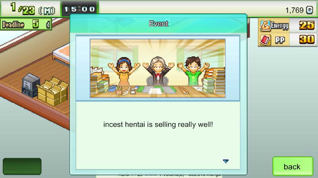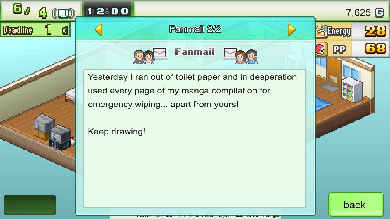 ข้อร้องเรียนที่สองของฉันเกี่ยวกับแผนกการศึกษา บทช่วยสอนนี้มีไว้เป็นส่วนใหญ่ แต่ไม่ได้บอกวิธีเขียนมังงะให้คุณจริงๆ จริงๆ แล้วคุณไม่ได้เขียนเรื่องราวของมังงะ แต่มีโครงเรื่องที่แตกต่างกัน หากคุณเรียงลำดับส่วนโค้งไม่ถูกต้อง คุณอาจสูญเสียความนิยมและอาจทำให้ซีรีส์มังงะของคุณถูกยกเลิก ทั้งนี้ขึ้นอยู่กับเรื่องราว ฉันทำงานได้ดี แต่คงจะดีถ้ามีระบบช่วยเหลือเช่น “Game Dev Studio” หรืออะไรทำนองนั้น นอกจากนี้ยังมีอินเทอร์เฟซผู้ใช้ที่แปลกและไม่สอดคล้องกันและส่วนใหญ่ประกอบด้วยข้อความ ข้อความบางส่วนเป็นข้อความพิกเซล Kairosoft แบบคลาสสิก และบางข้อความเป็นเพียง Arial บางครั้งก็มีเงาตกกระทบ ขึ้นอยู่กับเมนูที่แน่นอน สิ่งนี้อาจดูผิดที่ผิดทางจริงๆ แน่นอนว่านี่เป็นเรื่องของการแปลและการแปล แต่ก็ยังสับสนอยู่