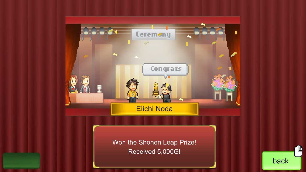 เมื่อคุณเริ่มเล่น The Manga Works จะสนุกจริงๆ เพราะคุณสามารถสร้างเรื่องราวมังงะของคุณเองได้ แต่พอผ่านไปสักพัก มันก็จะน่าเบื่อหน่อยๆ เพราะคุณทำสิ่งเดิมๆ ซ้ำไปซ้ำมา มันเหมือนกับว่าเกมไม่มีสิ่งต่าง ๆ เพียงพอที่จะทำให้เกมน่าตื่นเต้นได้นาน ฉันสนุกกับ Game Dev Story และ Dungeon Village มานานเท่าที่ฉันจำได้ และฉันก็สนุกกับเกมใหม่นี้ – บ้าง แต่นี่เป็นเกม Kairosoft สุดท้ายที่ผมจะเล่นไปอีกนาน เพราะมันมีปัญหามากมาย