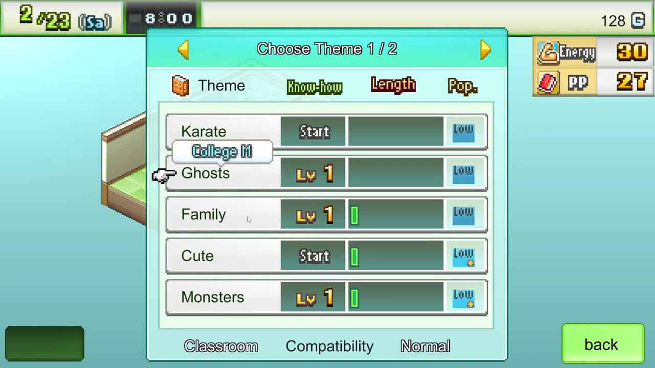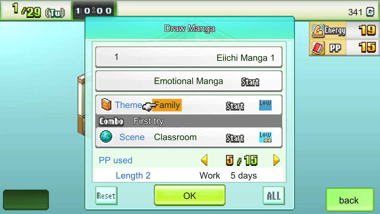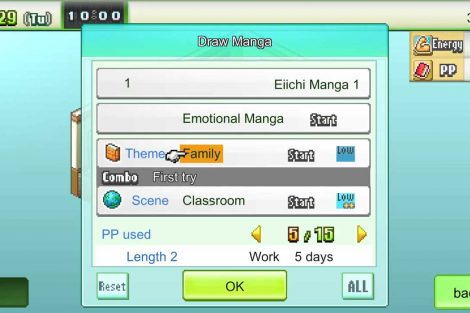 คุณต้องลงทุนเงิน เวลา และพลังงานในการไปห้องสมุด ร้านอาหาร พิพิธภัณฑ์ ฟังดูง่าย แต่ทั้งหมดนั้นขึ้นอยู่กับการทอยลูกเต๋า และอาจไม่ยุติธรรมเลย มันอธิบายยากนิดหน่อยหากคุณยังไม่ได้เล่น ดังนั้นฉันจะพยายามอธิบายให้ดีที่สุดเท่าที่จะทำได้ ปัจจุบันสิ่งที่ถูกและใช้เวลาน้อยที่สุดคือการไปห้องสมุด อย่างไรก็ตาม สิ่งนี้จะทำให้คุณได้รับคะแนนน้อยลง ดังนั้นคุณอาจมีช่วงเวลาที่ยากลำบากในการออกมังงะดีๆ เนื่องจากคุณใช้คะแนนเหล่านั้นกับฤดูกาลของเกม