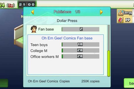 สิ่งที่แพงที่สุดที่ฉันเคยเห็นคือการไปเยี่ยมชมบริษัทเกม ตัวเลือกนี้มีราคาแพงมาก ต้องใช้เวลาและพลังงานมาก คุณคงคิดว่าตัวเลือกนี้จะให้การจ่ายเงินจำนวนมากใช่ไหม? ใช่และไม่ใช่ คุณสามารถรับคะแนนได้มาก แต่มีหลายครั้งที่รางวัลจะมากเท่ากับหนึ่งวันเต็มในห้องสมุด คุณใช้เงินไปมากจนดูไม่ยุติธรรมเลย หากคุณมีพนักงานในระยะนี้ คุณควรปล่อยพวกเขาไปเพราะว่าคุณจะหมดเงินเพื่อสนับสนุนพวกเขาในบางจุด นอกจากนี้คุณยังมีคะแนนพล็อตไม่เพียงพอที่จะสร้างมังงะที่ดีได้