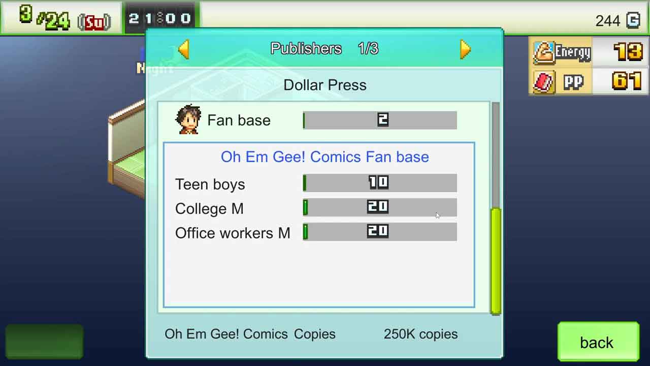 ใน The Manga Works ก็เหมือนกับเกมทุนนิยมอื่นๆ คุณกำลังพยายามทำให้ธุรกิจของคุณเติบโต และฉันชอบความจริงที่ว่าเกมนี้มีพื้นฐานมาจากการสร้างมังงะ นอกจากการเลือกธีม ทิวทัศน์ ฯลฯ ก็ไม่มีอะไรมาก ดังนั้นจึงเล่นได้ง่ายมากและยังค่อนข้างน่าติดตาม ในฐานะคนที่ชอบอ่านมังงะและดูอนิเมะ ฉันพยายามที่จะทำคะแนนให้ได้มากจริงๆ เมื่อคุณเริ่มต้นกับบริษัทขนาดเล็ก คุณจะรู้สึกถึงความยากลำบากในการก้าวหน้า แต่คุณสามารถสร้างชื่อเสียงในการทำงานร่วมกับบริษัทขนาดใหญ่ได้