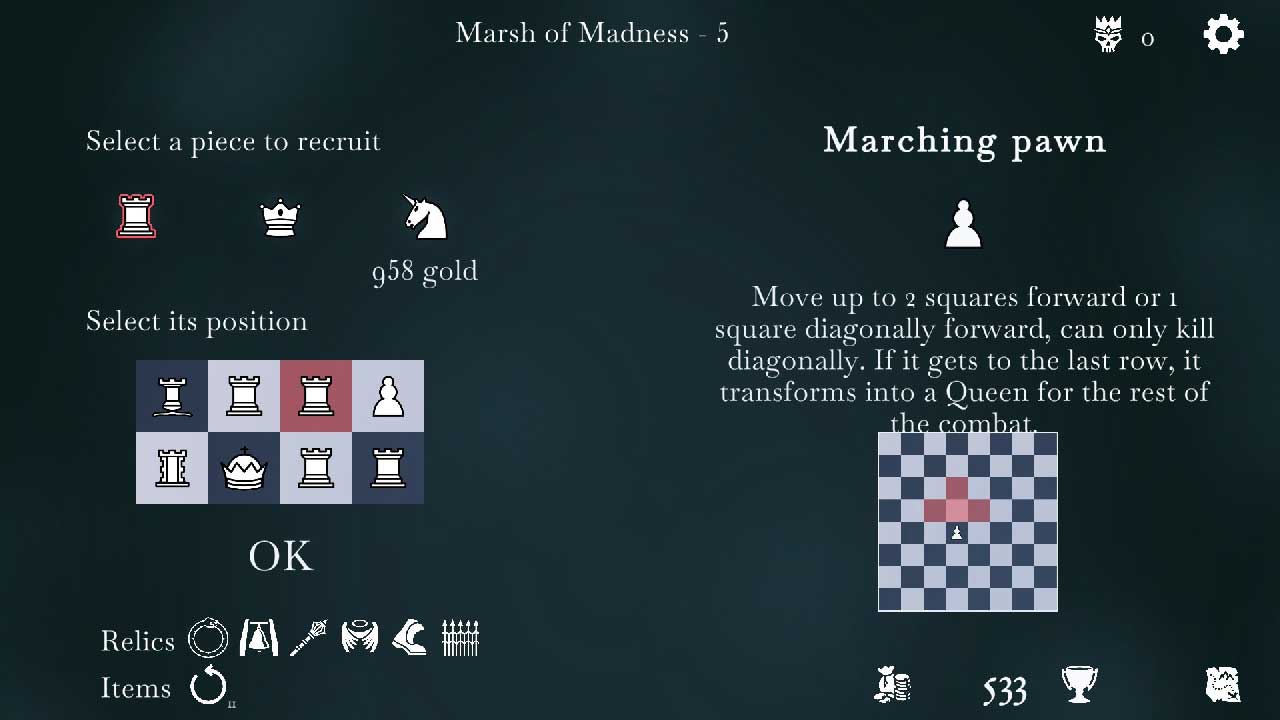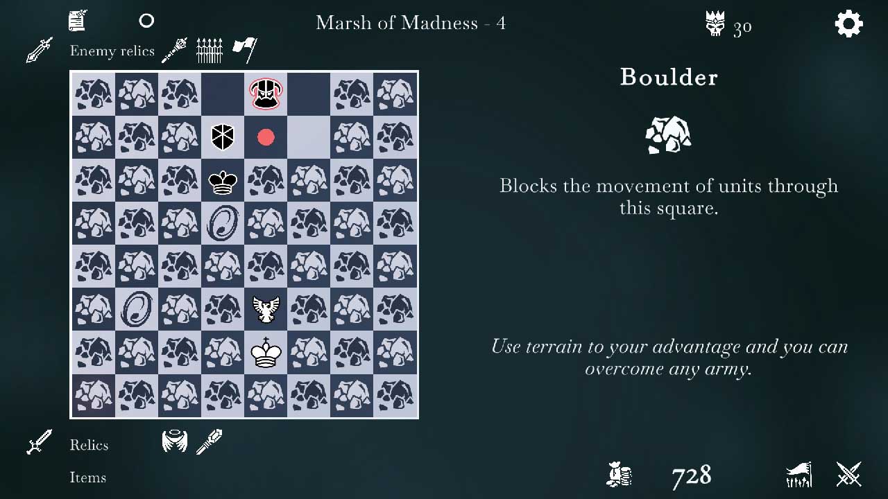 เกมโร๊คไลค์ที่ใช้หมากรุกไม่ใช่สิ่งที่คุณเจอทุกวัน แต่เกมนี้ดึงดูดความสนใจของฉันได้อย่างแน่นอน รูปแบบการเล่นทำให้คุณคิด แต่ในขณะเดียวกันก็ให้ผลตอบแทนที่คุ้มค่ามาก เป็นการผสมผสานระหว่างกลยุทธ์และโชคที่จะทำให้คุณนั่งไม่ติดเก้าอี้ ฉันชอบแง่มุมเทิร์นเบสของเกมเป็นพิเศษ ซึ่งเพิ่มความลึกให้กับการเล่นเกม กลไกนั้นง่ายต่อการเรียนรู้และมีความลึกในเกมให้สำรวจ