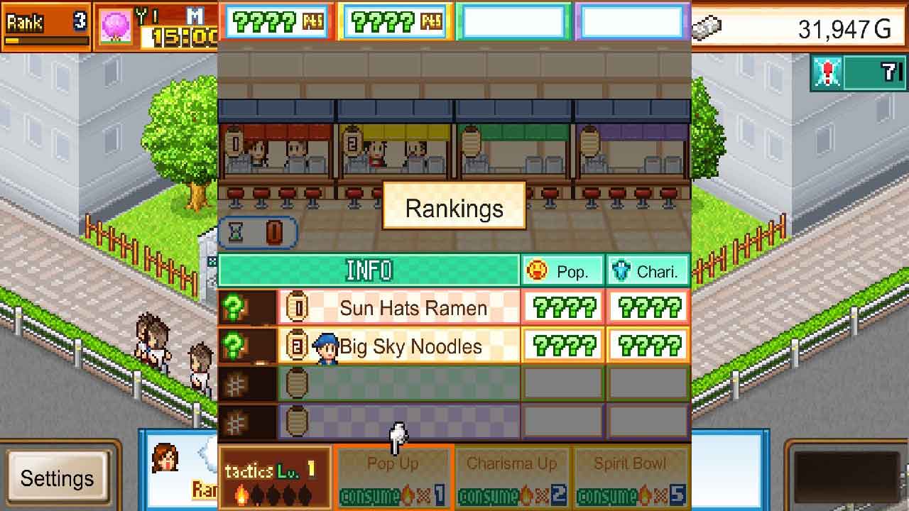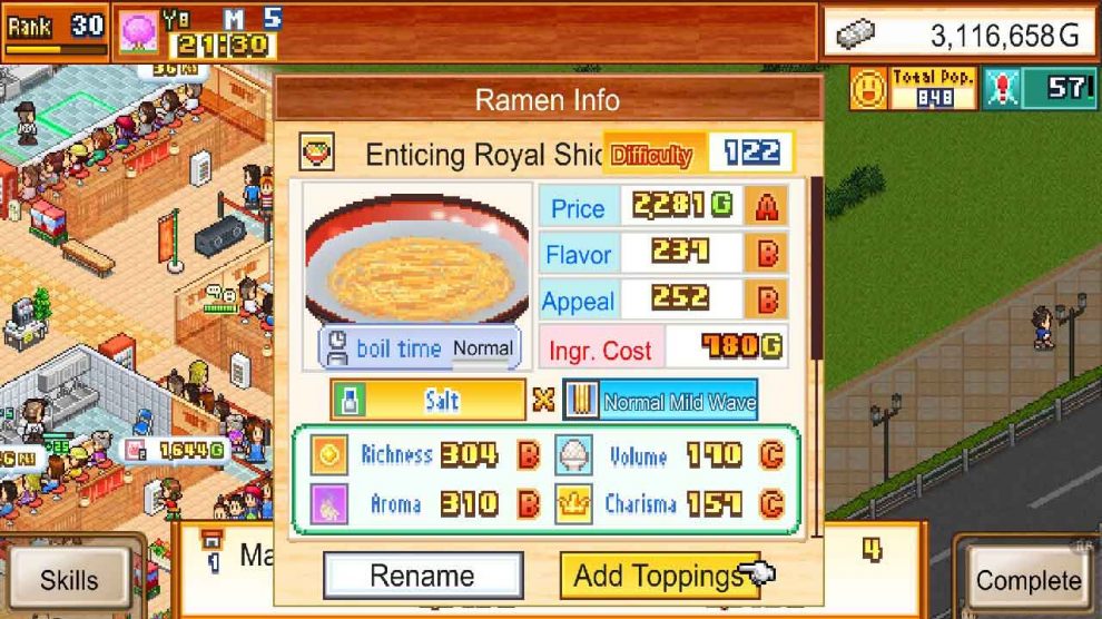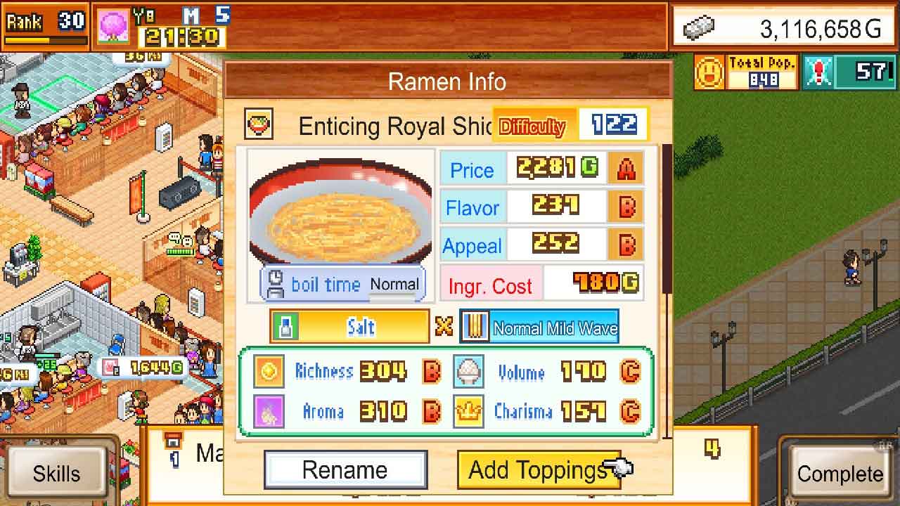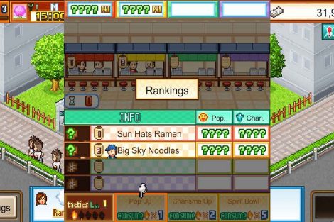 เมื่อคุณสร้างสูตรอาหารแล้ว คุณสามารถเพิ่มลงในเมนูและให้ลูกค้านำไปใช้ได้ ยิ่งลูกค้ามาเยี่ยมชมร้านค้าของคุณมากเท่าไร คุณก็จะได้รับคะแนนมากขึ้นและมีโอกาสเข้าร่วมการแข่งขันเกี่ยวกับการทำอาหารมากขึ้นเท่านั้น ที่จริงแล้ว นี่คือทัวร์นาเมนต์ที่ให้ใบอนุญาตแก่คุณในการทำอาหารราเม็งได้มากมาย และเป็นหนึ่งในวิธีที่ดีที่สุดในการรับคะแนนประสบการณ์