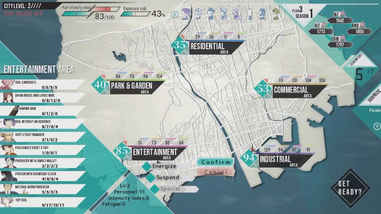 เด็กผู้หญิงมีคุณสมบัติ 4 ประการ คือ ความฉลาด ความมีน้ำใจ เสน่ห์ และความมีชีวิตชีวา การประเมินขั้นสุดท้ายคือหลังจากการเปลี่ยนแปลงบทที่หก คุณในฐานะผู้จัดการจะต้องรายงานต่อเลขานุการทุกบท และเลขานุการจะสุ่มมอบทักษะสามอย่างตามความก้าวหน้าของเมืองและแผงของหญิงสาว พื้นที่โครงการในเมืองส่วนใหญ่ ได้แก่ สวนสาธารณะ พื้นที่พักอาศัย สถานที่พักผ่อนหย่อนใจ และสถาบันวิจัย เป็นต้น เกมดังกล่าวมีคะแนนการบริโภค 5 คะแนน และการใช้แต่ละครั้งจะเพิ่มดัชนีพลังชีวิตของพื้นที่ หรือใช้เพื่อค้นหาทักษะเฉพาะตัว คะแนนการใช้จะถูกรีเซ็ตทุกครั้งที่เริ่มฤดูกาลใหม่ ในตอนท้ายของบท มีโปสเตอร์ที่มีภาพที่เหมือนจริงซึ่งทำให้เราทราบข้อมูลเพิ่มเติมเกี่ยวกับโลกเกี่ยวกับหัวข้อหนึ่งๆ