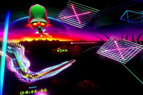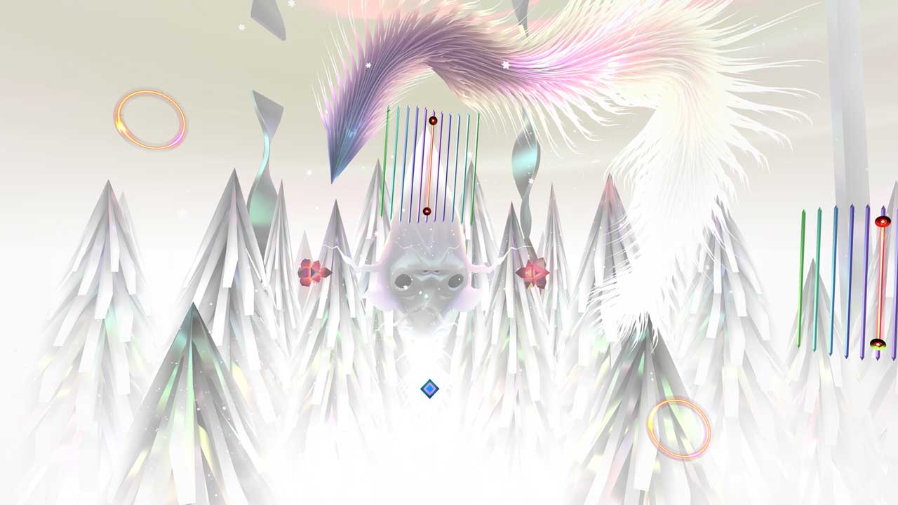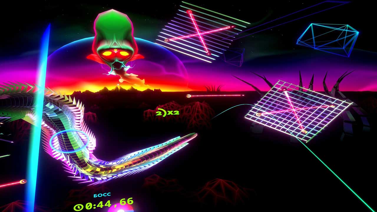 ด่านต่างๆ ถูกแบ่งออกเป็นด่านย่อยๆ ที่มีกระดานคะแนนของตัวเอง ซึ่งทำให้ด่านสั้นกว่าด่านใน Thumper มาก ซึ่งผมชอบมาก ทำให้เริ่มเล่นได้ง่ายและเล่นได้ไม่นาน โดยเฉพาะอย่างยิ่งถ้าเล่นใน VR ซึ่งเกมไม่ต้องใช้ความพยายามมากนัก คุณแค่หยิบจอยมาแล้วมองไปรอบๆ ทำให้การพยายามทำคะแนนสูงๆ ในแต่ละด่านสนุกยิ่งขึ้น
