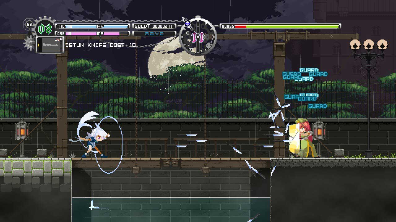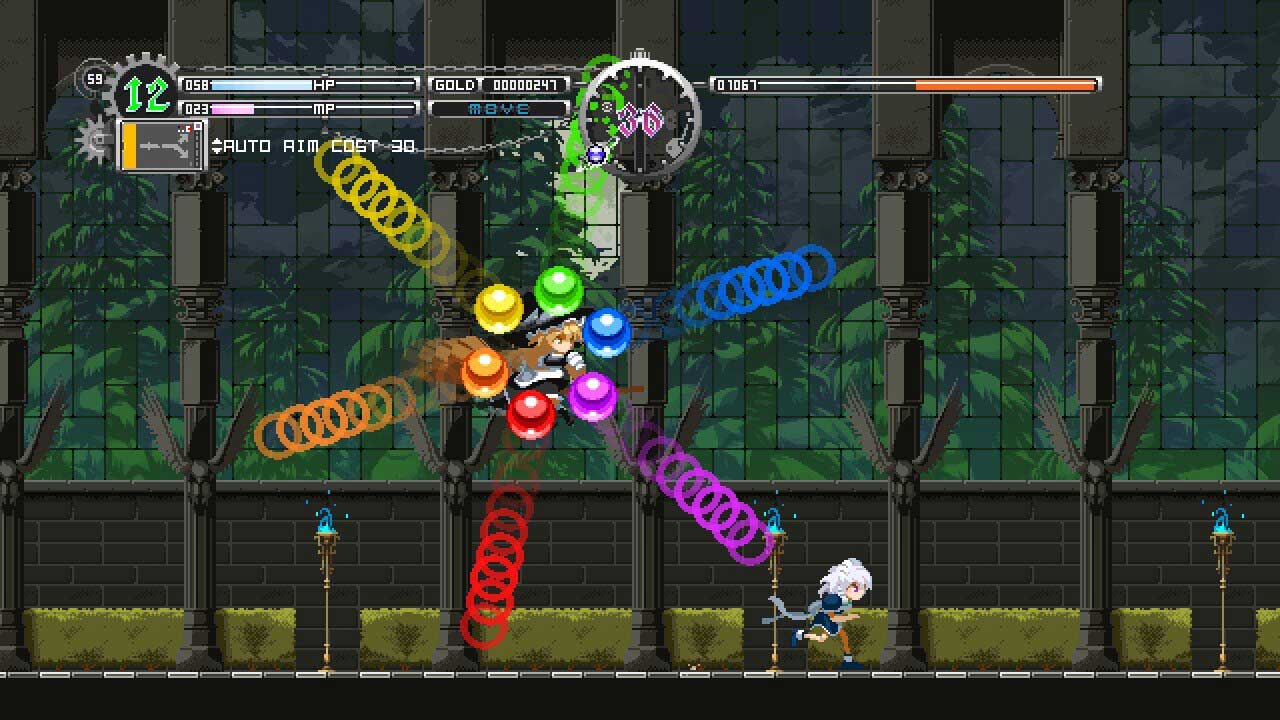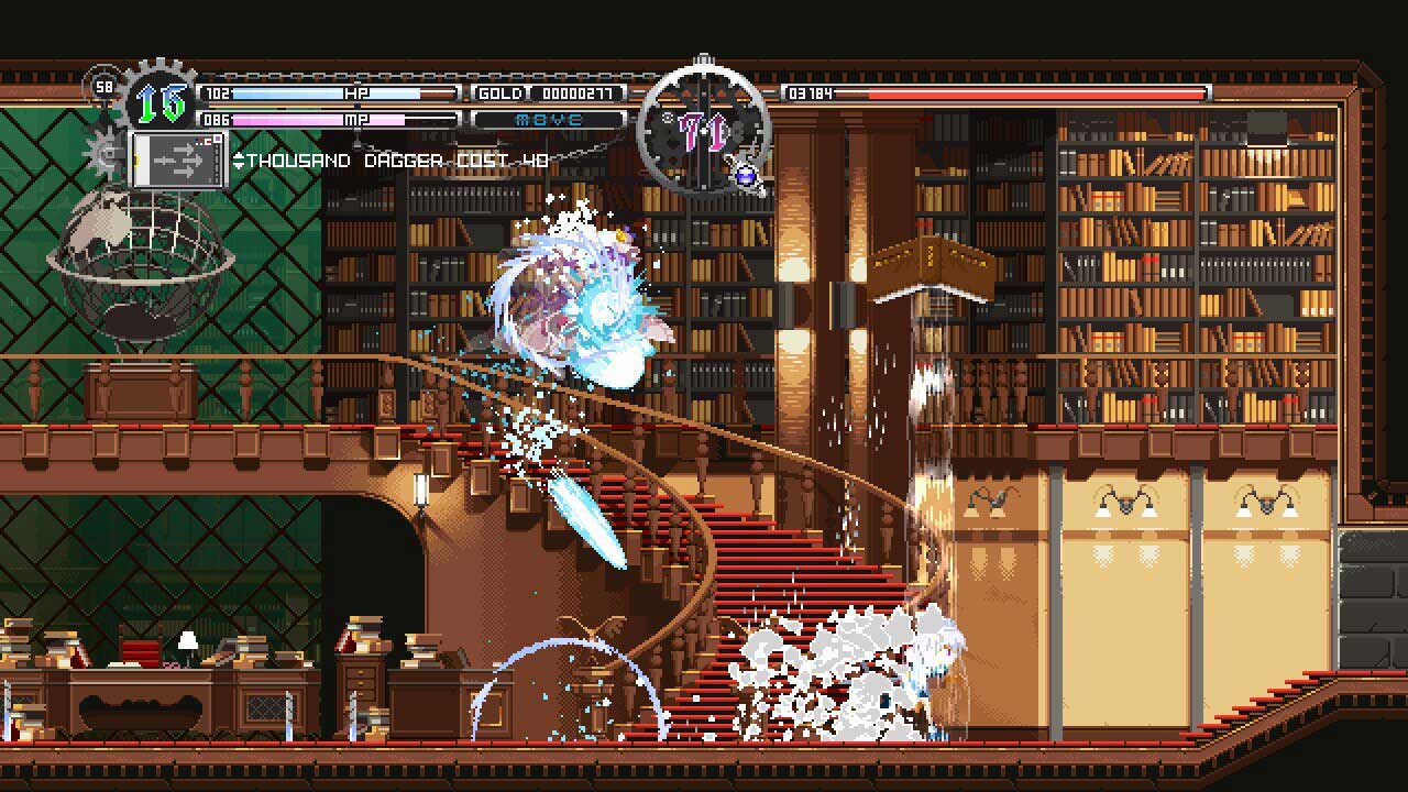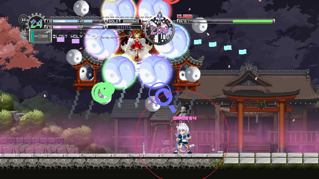 แน่นอนว่าซาคุยะสามารถใช้พลังได้ตลอดเวลา ในตอนแรก มันเป็นเพียงความสามารถในการชะลอเวลาสำหรับทุกสิ่งยกเว้น Sakuya และมีดของเธอ แต่คุณปลดล็อกพลังอย่างรวดเร็วเพื่อหยุดเวลาโดยสิ้นเชิง สร้างไดนามิกใหม่สำหรับการต่อสู้และการไขปริศนา ตัวอย่างเช่น กลไก Time Stop อนุญาตให้คุณ Graze ได้ฟรี แต่คุณดึงมาจากกลุ่มการกู้คืนแยกต่างหากซึ่งจะไม่ฟื้นฟู HP คุณยังสามารถเดินบนน้ำในช่วงเวลาหยุดชั่วคราว หยุดศัตรูและแท่นที่กำลังเคลื่อนที่ และยิงมีดจำนวนมากเพื่อปล่อยเมื่อเวลากลับมาอีกครั้ง กลไกนี้มีความสำคัญมากและเมื่อทำสำเร็จแล้วก็สามารถนำไปใช้ประโยชน์ได้อย่างง่ายดาย