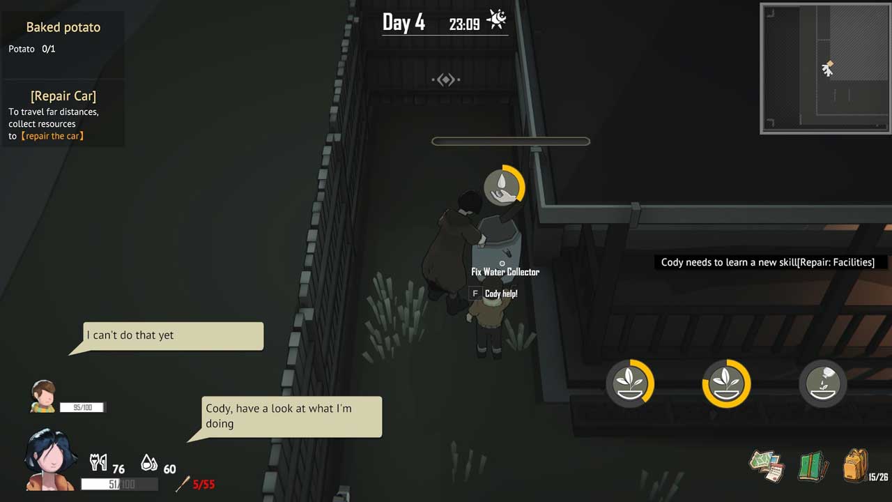 Anling ต้องทำงานและดำเนินการบางอย่างกับ Cody เพื่อปลดล็อก/ฝึกฝนชุดทักษะบางอย่าง ชุดทักษะแต่ละชุดแบ่งออกเป็นสามสายเทคโนโลยี – การต่อสู้ การเอาชีวิตรอด และการสร้าง ผู้เล่นบางคนอาจไม่ชอบแนวทางนี้ที่ Cody ไม่ได้เรียนรู้ทักษะเมื่อเวลาผ่านไป แต่ Anling มีหลายสิ่งที่ต้องทำเพื่อสอนเขา ในความคิดของฉัน สิ่งนี้ช่วยโครงเรื่องของเกมได้ไม่น้อยและสร้างความรู้สึกดื่มด่ำที่ดีขึ้น
