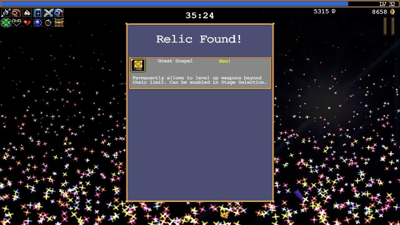 ในแต่ละระดับใหม่ คุณสามารถเลือกสิ่งใหม่ได้ – อาวุธหรือทักษะแบบพาสซีฟ นอกจากนั้น คุณยังทำลายสิ่งของต่าง ๆ เพื่อรับเงินและไอเทมการรักษาหรือไอเทมที่มีพลังต่าง ๆ เช่น เวลาแช่แข็ง หรือกำจัดศัตรูทุกตัวบนหน้าจอ มีตัวละครมากมายและแต่ละตัวก็มีอาวุธหลัก จุดแข็งและจุดอ่อนของตัวเอง ตัวละครแต่ละตัวสามารถรับและเพิ่มระดับอาวุธและไอเท็มได้หกชิ้นในแต่ละด่าน เมื่อช่องเหล่านั้นเต็มแล้ว จะไม่มีการดรอปไอเท็มใหม่ และคุณจะต้องเพิ่มเลเวลพวกมัน ดังนั้นสิ่งสำคัญคือต้องวางกลยุทธ์ตั้งแต่เนิ่นๆ ว่าคุณจะเข้าใกล้ฉากการต่อสู้อย่างไร