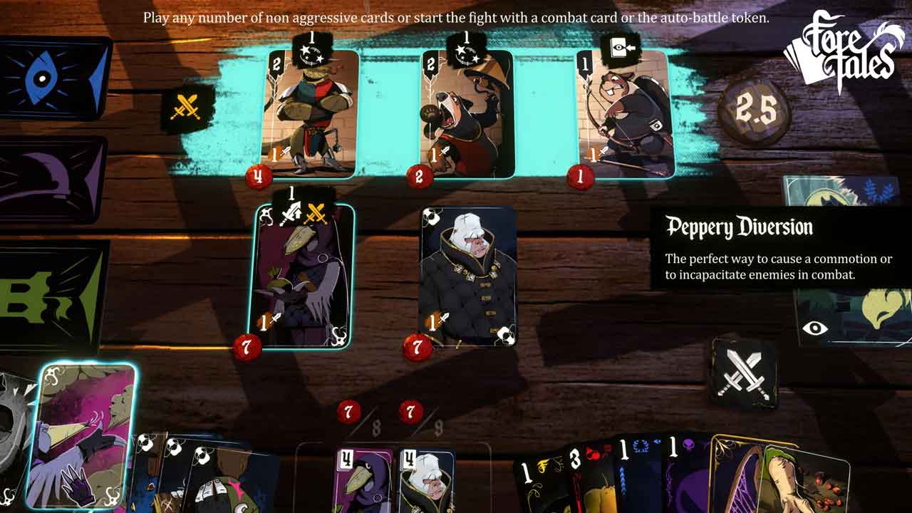 ในเกม ผู้เล่นจะมีช่วงเวลาที่ดีและคุณจะประทับใจเป็นพิเศษกับจำนวนภารกิจที่หลากหลาย แม้ว่าด่านหลังๆ จะเริ่มเล่นการ์ดสถานที่แบบเดียวกับที่คุณเคยเยี่ยมชมมาก่อนก็ตาม อย่างไรก็ตาม สิ่งที่น่าสนใจอย่างหนึ่งเกี่ยวกับ Foretales คือการต่อสู้แบบผลัดกันเล่นที่เน้นไหวพริบและการทูตเหนือกำลังดุร้าย แน่นอนว่าคุณสามารถแฮ็กศัตรูเป็นชิ้น ๆ ยิงกระสุนปืนใหญ่ใส่พวกเขา และใช้กลอุบายของ Volepain เพื่อทำให้พวกมันสับสนและทำให้สับสนได้ แต่ชัยชนะนั้นหวานกว่าเสมอเมื่อมีเลือดหยดอยู่ในกระบวนการ มีหลายวิธีในการบรรลุเป้าหมายนี้ใน Foretales ไม่ว่าจะเป็นการรวบรวมชื่อเสียงผ่านการทำความดี ติดสินบนพวกเขาด้วยอาหารหรือเงิน หรือใช้การ์ดกริมที่เก็บไว้ในมือของคุณ ไม่ว่าคุณจะทำด้วยวิธีใด เกมทั้งเกมเป็นการทำให้ขวัญกำลังใจของทีมศัตรูลดลงจนเหลือศูนย์ จากนั้นศัตรูที่เหลือจะถูกฆ่าโดยอัตโนมัติ และอีกครั้ง คุณได้รับข้อมูลทั้งหมดที่จำเป็นสำหรับการตัดสินใจที่ถูกต้องและคำนวณแล้ว เพื่อผลักดันให้คุณไปสู่ชัยชนะ